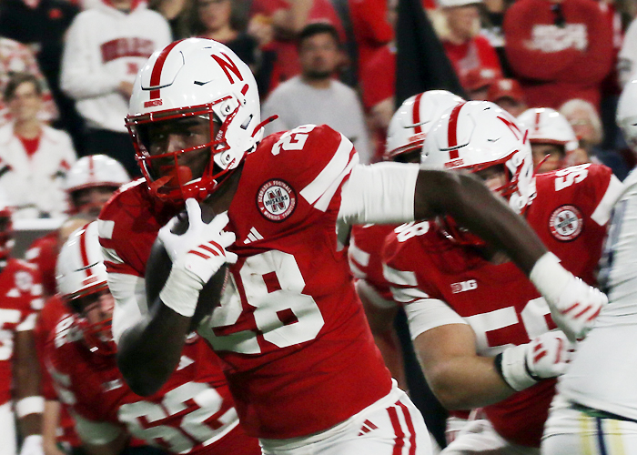 The running backs showed-out during last month’s Nebraska spring game. An improved running game, especially without last year’s star running back Emmett Johnson, will be critical to the Huskers success during the upcoming 2026 season. Kwinten Ives (pictured above), will enter fall camp in contention for playing time along with Mekhi Nelson, Jamal Rule, Isaiah Mozzee and Conor Booth. (Photo by Jack Denker/Sports Plus)