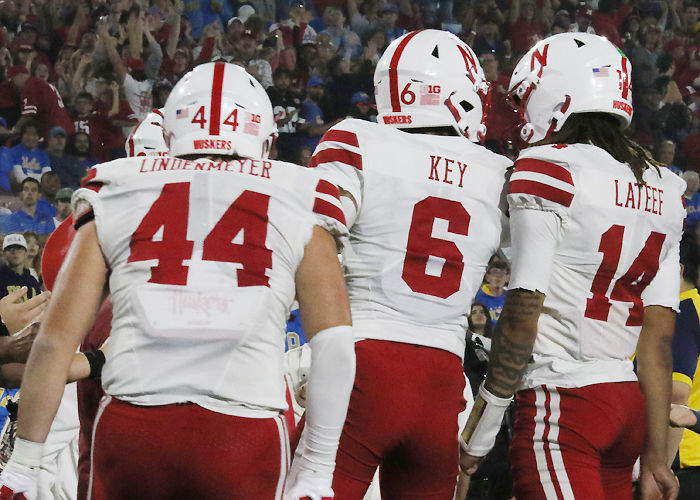 Returning starters Luke Lindenmeyer, at tight end, and TJ Lateef, at quarterback, will lead the Nebraska football team into spring football practices starting this month. (Photo by Jack Denker/Sports Plus)
