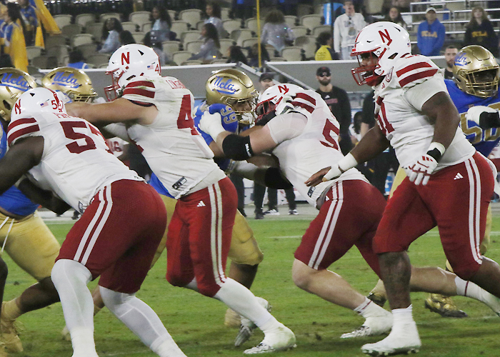 Even though it’s still considered winter, the Nebraska football team started spring practice on Feb. 21, 2026. It’s the earliest start for spring football practices in school history. Rebuilding the offensive line, starting with returning starters Justin Evans (51) and Elijah Pritchett (57), will be among the many priorities for this year’s Husker football team. (Photo by Jack Denker/Sports Plus)